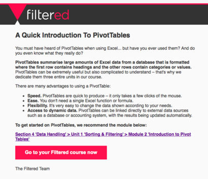 Filtered is designed to strengthen your IT, business and presentation skills, improve your CV, prepare your next appraisal and increase your career prospects incredibly quickly. We find out what you already know and exclude it from your course, saving you time and boosting your productivity.